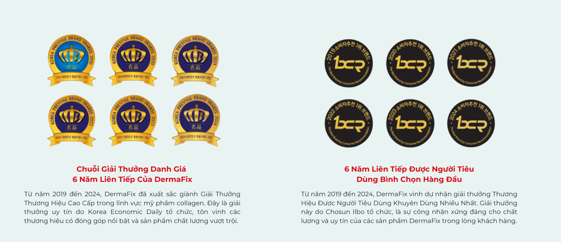 Sự nỗ lực và chất lượng vượt trội của DermaFix đã được ghi nhận qua hàng loạt giải thưởng danh giá. Những giải thưởng này không chỉ là niềm tự hào của DermaFix mà còn khẳng định giá trị thương hiệu trong mắt người tiêu dùng.